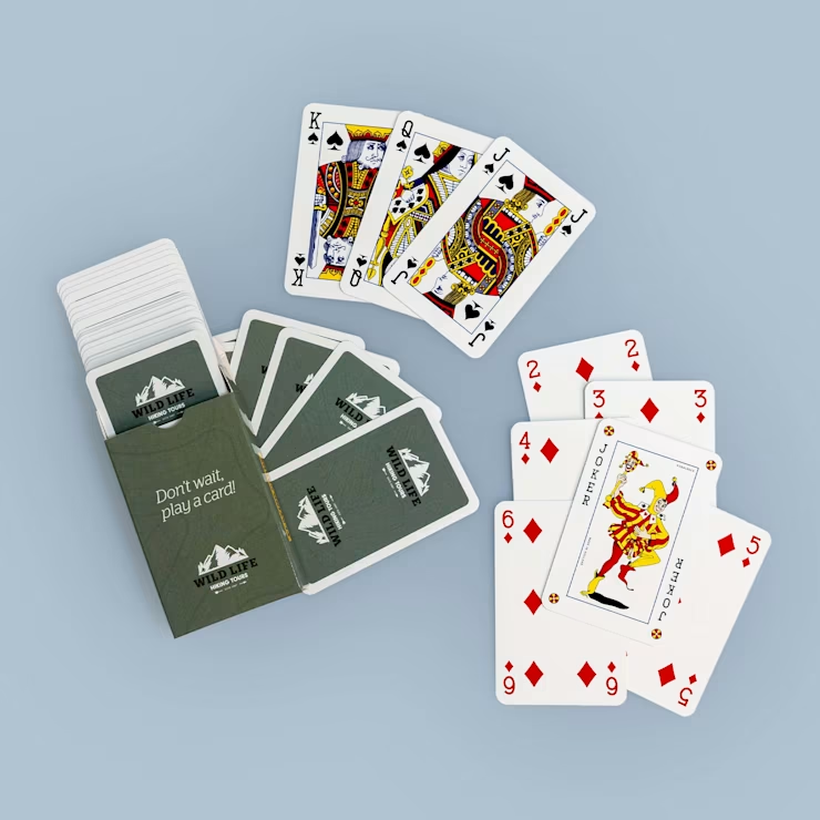 Zet jouw merk letterlijk op de kaart! Ontwerp je eigen speelkaarten met logo, foto of creatief design en verras klanten of relaties met een origineel cadeau. Perfect voor borrels, beurzen of als promotieartikel. Onze speelkaarten drukken we op stevig 320 grams karton met zwarte tussenlaag. Kies uit internationale of Nederlandse sets en voeg een luxe verpakking toe: transparante houder of bedrukt kartonnen doosje.
